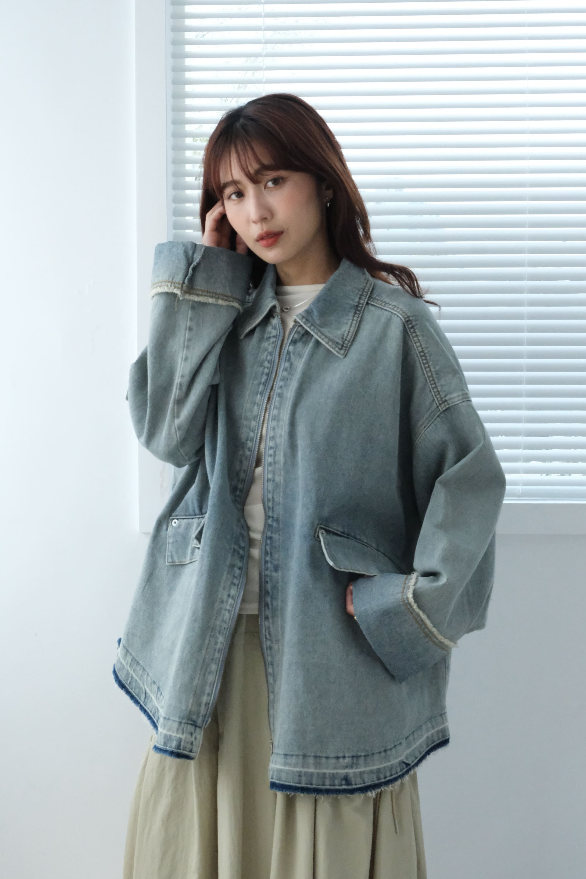 △時髦寬袖抽鬚設計 下擺毛邊刷色做舊效果